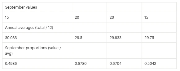 Seasonal Index (Sept) = 17.5 / 29.79…